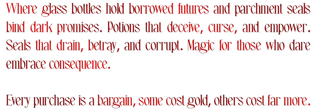 Curse Carrier: This isn't a potion you drink, it's a weapon you inflict. Pour even a single drop into someone's food or drink, and they become a walking curse. For the next week, misfortune clings to them like a second shadow. Locks jam when they try to open them, weapons break in their hands, allies mistrust them, minor injuries become infected, and sleep brings only nightmares. Nothing catastrophic alone, but the accumulation is maddening. The victim won't realize they're cursed, they'll just think they're having the worst week of their life. Perfect for subtle revenge or undermining a rival without direct confrontation. The bottle contains enough for three doses.